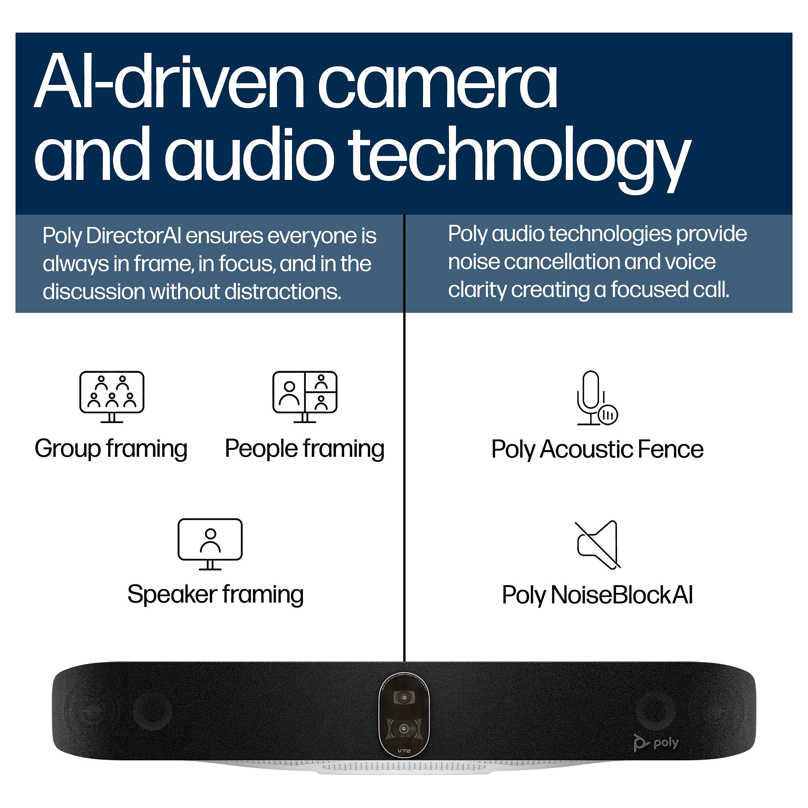 Είτε διενεργείτε παρουσιάσεις, απομακρυσμένες συναντήσεις, είτε συνεργατικές συνεδρίες, η Poly Studio V72 ξεχωρίζει με την υψηλής ποιότητας απόδοση ήχου και βίντεο. Τα καινοτόμα χαρακτηριστικά όπως το Poly DirectorAI επιτρέπουν την έξυπνη καδράρισμα ομιλητών και συμμετεχόντων, ενισχύοντας την εμπειρία εικονικών συναντήσεων.