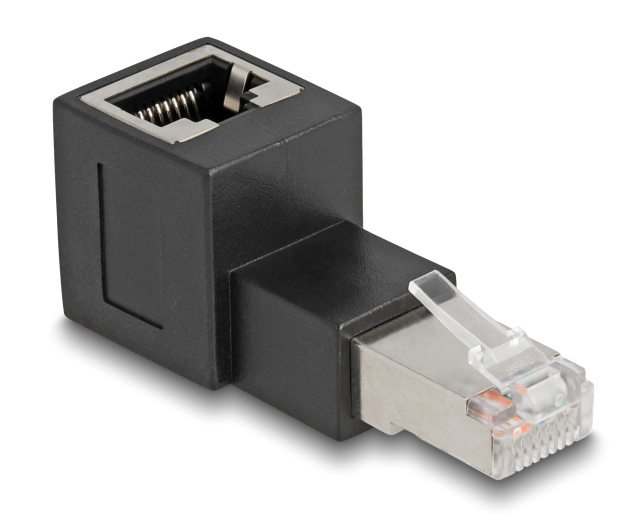 Με αυτό τον αντάπτορα της Delock η θηλυκή θύρα RJ45 μιας συσκευής μπορεί να αποκτήσει γωνία κατά 90°. Αυτό το εξάρτημα κάνει πιο εύκολη τη σύνδεση ενός καλωδίου δικτύου σε σημεία με δύσκολη πρόσβαση, αποτρέποντας τη φθορά στη θύρα της συσκευής ή στο καλώδιο εξαιτίας του λυγίσματος.