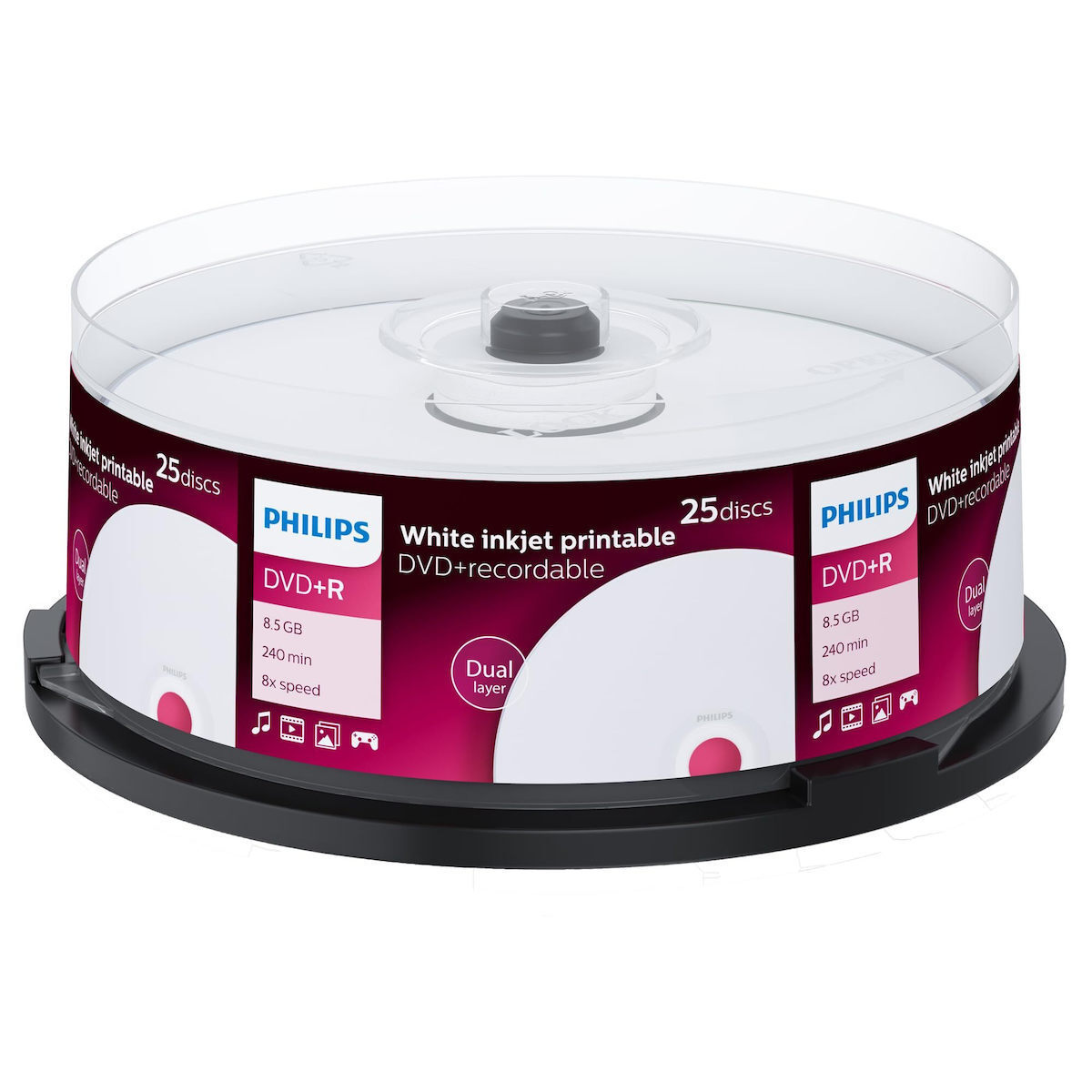 Το Philips DVD+R 12cm 1x25 8,5GB DL 8x IW SP είναι δίσκοι οπτικής αποθήκευσης μιας χρήσης (write-once) με χωρητικότητα 8,5 GB ανά δίσκο και δυνατότητα εγγραφής έως 8x. Πρόκειται για δίσκους double-layer DVD+R, κατάλληλους για αποθήκευση βίντεο, δεδομένων και άλλων ψηφιακών αρχείων σε συμβατές συσκευές εγγραφής DVD. Η συσκευασία περιλαμβάνει 25 δίσκους σε spindle/cake box, με print surface και τυπική διάμετρο δίσκου 12 cm. Η συνολική διάρκεια αποθήκευσης φτάνει περίπου τα 240 λεπτά ή 4 ώρες ανά δίσκο, ενώ η εγγραφή ενός πλήρους DVD μπορεί να ολοκληρωθεί σε περίπου 8 λεπτά. Κατασκευαστής είναι η Philips, με MPN DR8I8B25F/00 και EAN 8712581383787.