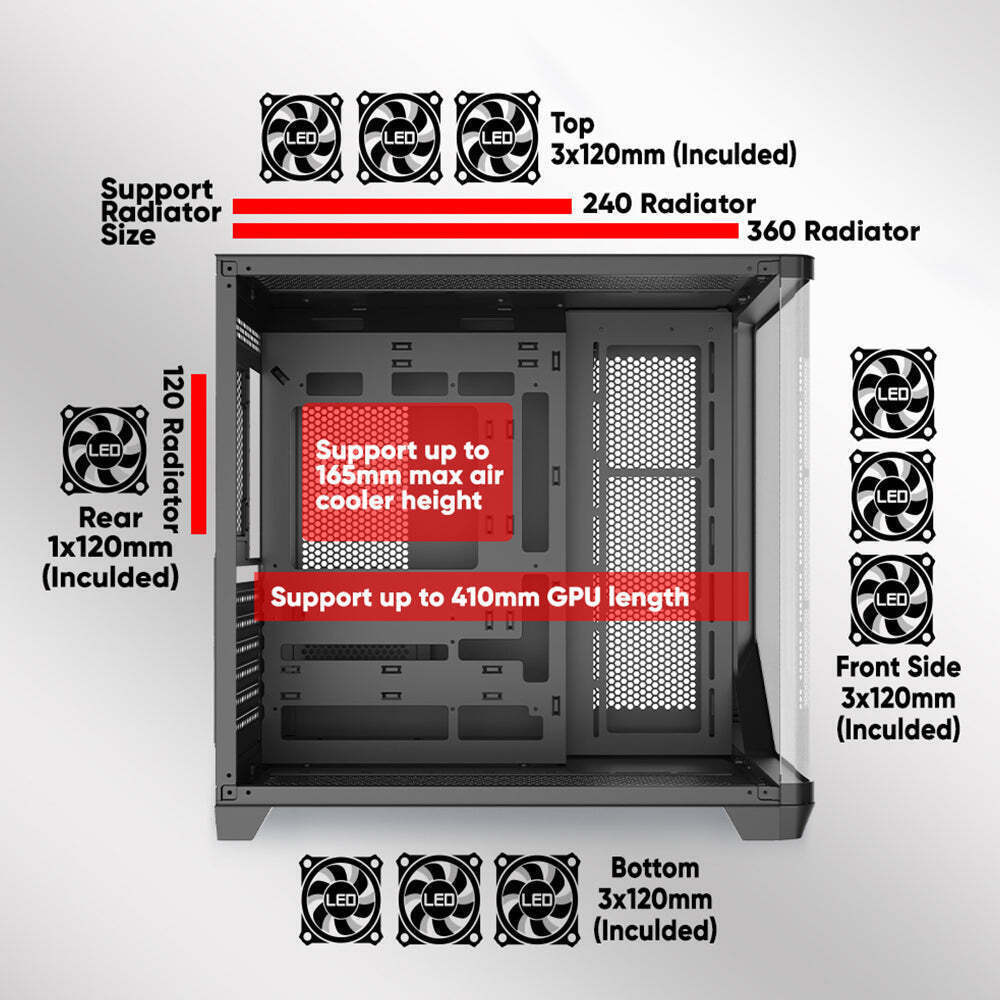 Special FeaturesHigh airflow design, pillarless gaming case styling, stealth cable management, PSI shroud, premium showcase aesthetics