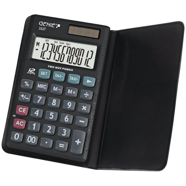 Αριθμομηχανή τσέπης 12 ψηφίων με λειτουργία φορολόγησης / αποφορολόγησης για υπολογισμό τιμών και πρακτική προστατευτική θήκη. Μικρή σε μέγεθος και πολύ ελαφριά. Με διπλή παροχή ενέργειας από μπαταρία και τον ήλιο.
