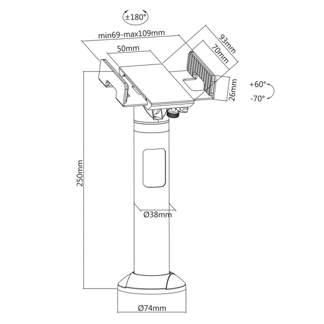 - Ρυθμιζόμενο Πλάτος: Ο στήριγμα μπορεί να φιλοξενήσει τερματικά με πλάτη που κυμαίνεται από 69 mm έως 109 mm, κάνοντάς το κατάλληλο για μια ποικιλία τερματικών πληρωμών.
