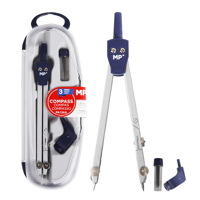 Σετ μεταλλικού διαβήτη της MP, 3 τεμαχίων, κατάλληλος για χρήση στο σχολείο, στη γεωμετρία και στο σχέδιο. Προσφέρει μεγάλη ακρίβεια και συνοδεύεται από ανταλλακτικές μύτες και πρόσθετη ροδέλα για μολύβι.