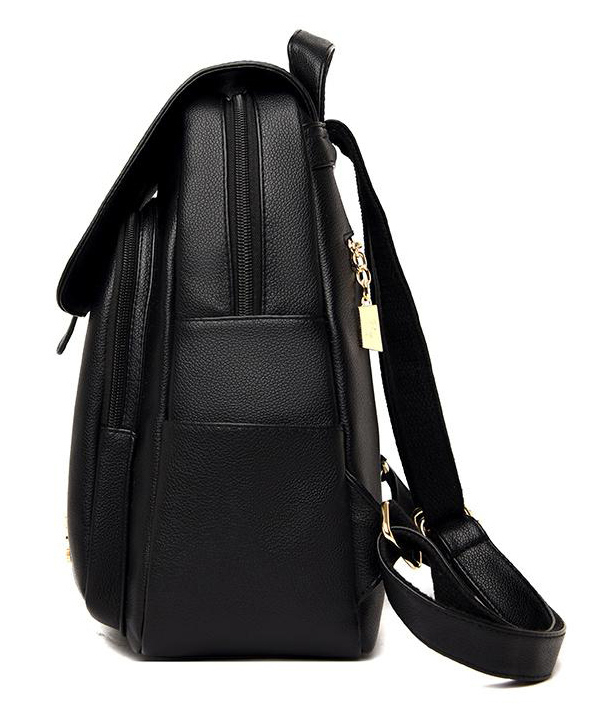 Τσάντα πλάτης με μοντέρνο design, σε μαύρο χρώμα, με χρυσές λεπτομέρειες. Διαθέτει πολλές εσωτερικές και εξωτερικές τσέπες, για να τοποθετήσετε χρήσιμα αντικείμενα.