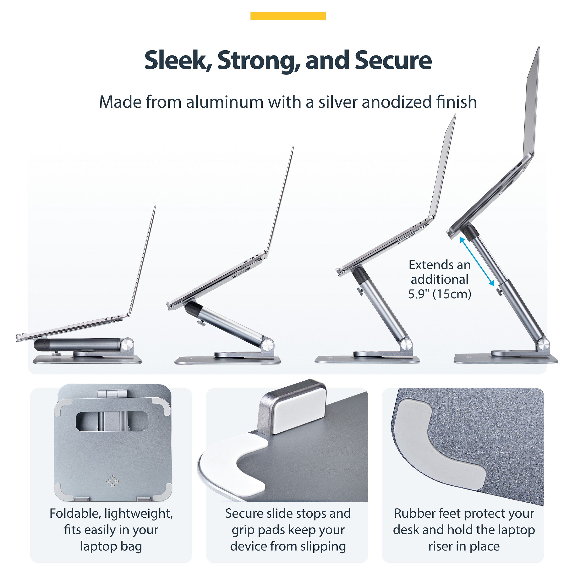 Ο StarTech.com ATER-LAPTOP-RISER είναι ο ιδανικός σύμμαχος για έναν πιο εργονομικό χώρο εργασίας. Αυτός ο ρυθμιζόμενος τηλεσκοπικός βάση φορητού υπολογιστή μπορεί να ανυψώσει το φορητό σας υπολογιστή στο επίπεδο των ματιών, εξασφαλίζοντας άνεση και μειώνοντας την πίεση στον αυχένα και την πλάτη.