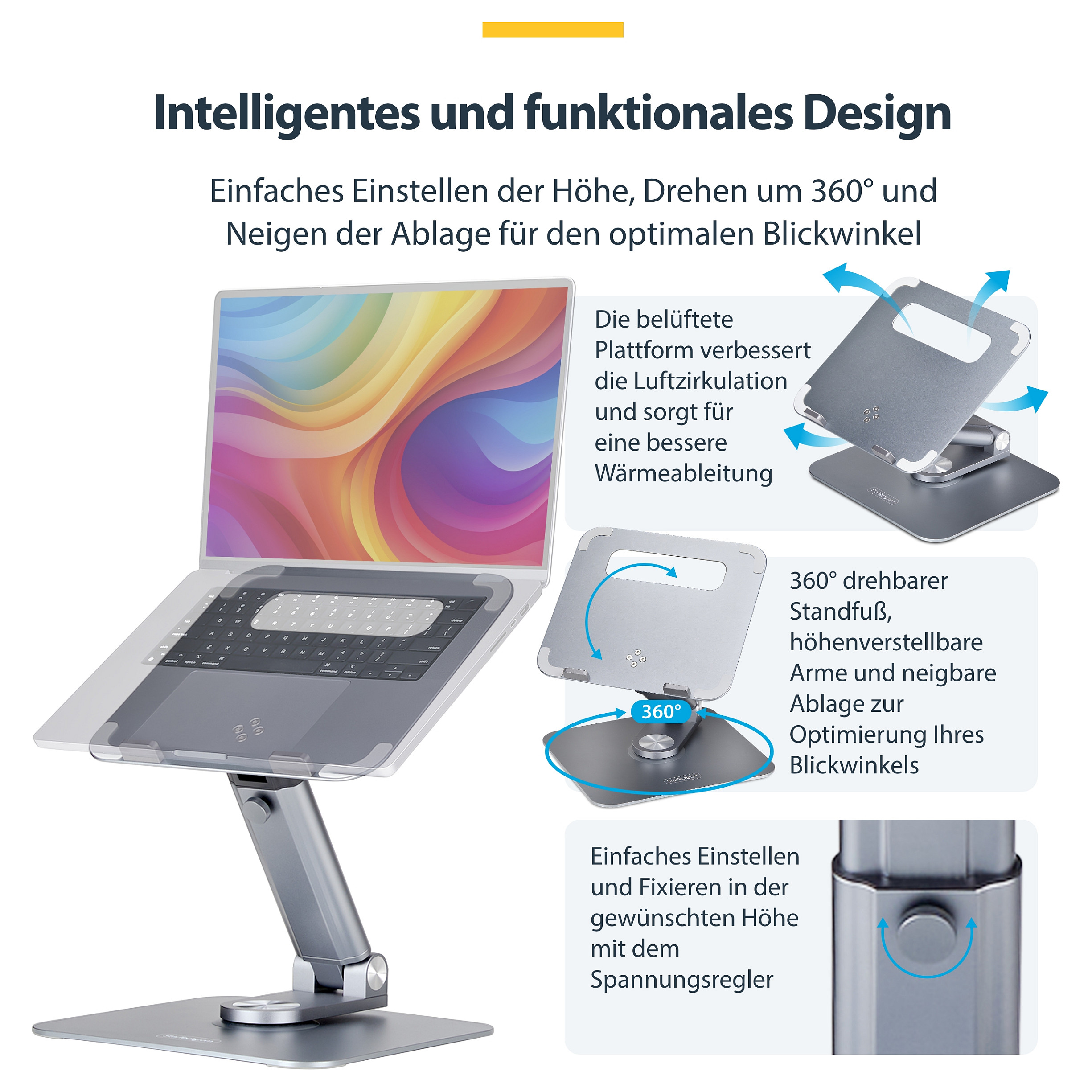 Σχεδιασμένος για σταθερότητα και αερισμό, η βάση διαθέτει μια αερισμένη πλατφόρμα αλουμινίου ικανή να υποστηρίζει φορητούς υπολογιστές με βάρος έως 11 lbs (5 kg). Η βάση περιστροφής 360° επιτρέπει ευελιξία στη θέση, διευκολύνοντας την κοινή χρήση της οθόνης ή τη ρύθμιση της θέας σας.