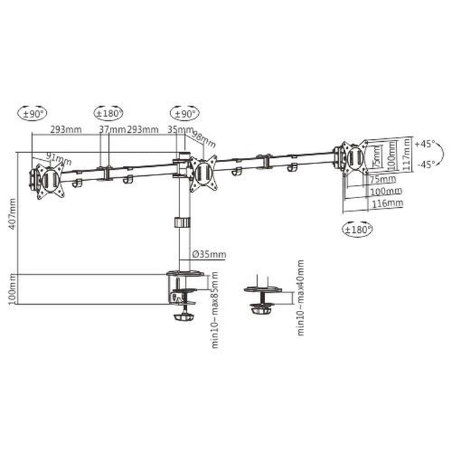 Σχεδιασμένος να κρατάει οθόνες που κυμαίνονται σε μέγεθος από 17 έως 27 ίντσες, υποστηρίζει ένα μέγιστο βάρος 7 kg ανά οθόνη. Το βραχίονα συμμορφώνεται με τα VESA standards των 100 x 100 mm και 75 x 75 mm, εξασφαλίζοντας συμβατότητα με μια ευρεία ποικιλία οθονών.