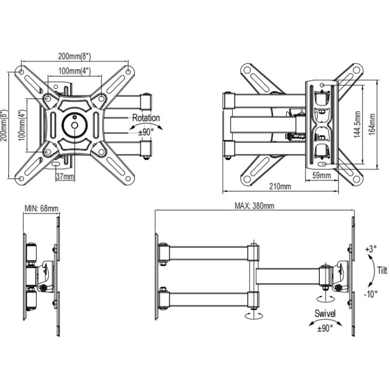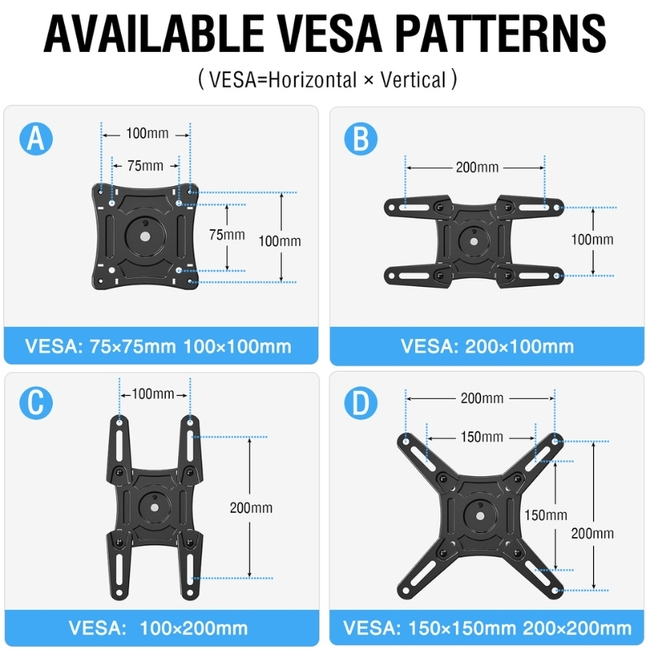 - VESA: 75x75, 100x100, 200x100, 100x200, 150x150, 200x200