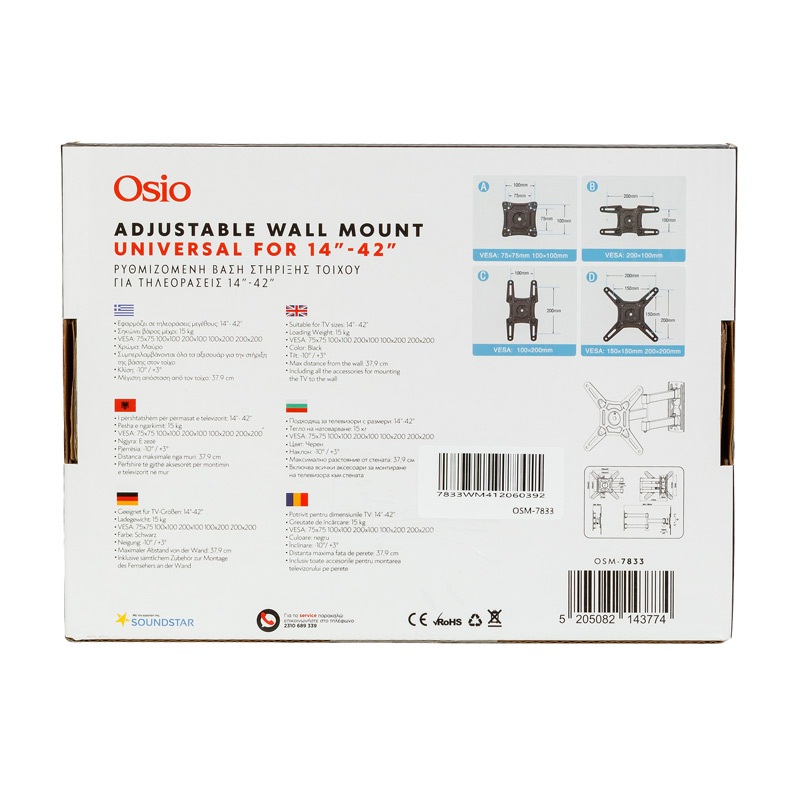 Η ρυθμιζόμενη βάση στήριξης τοίχου OSM-7833 για τηλεοράσεις αποτελεί την ιδανική λύση για όσους αναζητούν έναν αξιόπιστο και κομψό τρόπο να τοποθετήσουν την τηλεόρασή τους. Κατασκευασμένη για ευκολία στη χρήση και αντοχή, αυτή η βάση συνδυάζει λειτουργικότητα με minimal σχεδιασμό. Κατάλληλη για τηλεοράσεις μεγέθους 14"-42", η βάση μπορεί να στηρίξει συσκευές με μέγιστο βάρος έως 15kg. Είναι συμβατή με τα πρότυπα VESA 75x75, 100x100, 200x100, 100x200, 150x150, 200x200, εξασφαλίζοντας μεγάλη ευελιξία στη χρήση. Προσφέρει δυνατότητα ρύθμισης κλίσης από -10° έως +3°, επιτρέποντας την ιδανική γωνία θέασης, ενώ η μέγιστη απόσταση από τον τοίχο φτάνει τα 37.9cm, για επιπλέον άνεση. Η βάση διατίθεται σε κομψό μαύρο χρώμα που ταιριάζει σε κάθε χώρο, ενώ το καθαρό βάρος της είναι μόλις περίπου 1kg, διατηρώντας την ελαφριά αλλά ανθεκτική. Στη συσκευασία περιλαμβάνονται όλα τα απαραίτητα αξεσουάρ για τη στήριξη της βάσης στον τοίχο, καθιστώντας την εγκατάσταση γρήγορη και απλή.