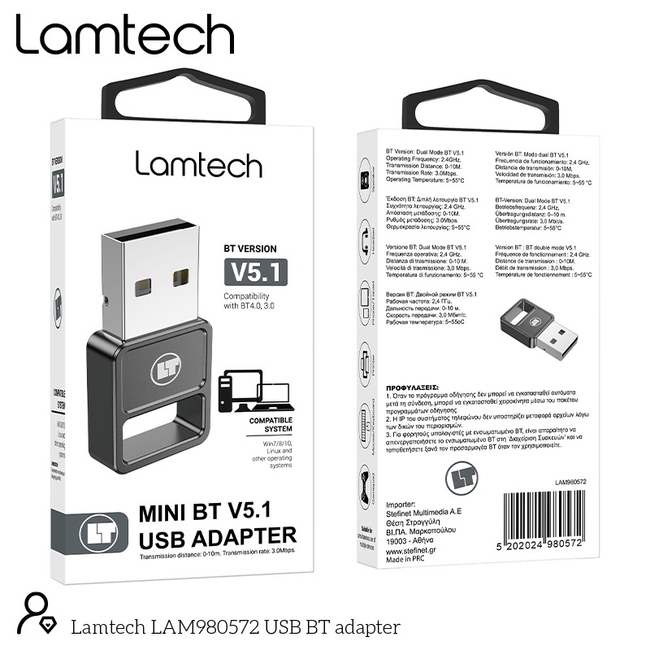 <p style="text-align: right;" data-start="206" data-end="269"><strong data-start="212" data-end="267"><a href="https://drive.google.com/file/d/1WVClJ-Jt5OgXx-f3rjy2qz2JqQ1OZ-Nm/view" target="_blank" rel="noopener">EU ΔΗΛΩΣΗ ΣΥΜΜΟΡΦΩΣΗΣ</a>  </strong></p><p data-start="206" data-end="269"><strong data-start="212" data-end="267">LAMTECH Mini Bluetooth V5.1 USB Adapter (LAM980572)</strong></p><p data-start="270" data-end="315"><strong data-start="270" data-end="315">Ασύρματη σύνδεση με αξιοπιστία &amp; ευελιξία</strong></p><p data-start="317" data-end="679">Ο <strong data-start="319" data-end="340">LAMTECH LAM980572</strong> είναι ένας <strong data-start="352" data-end="398">μικρών διαστάσεων Bluetooth αντάπτορας USB</strong>, ιδανικός για να προσθέσετε ή να αναβαθμίσετε τη δυνατότητα Bluetooth στον υπολογιστή ή το laptop σας. Με υποστήριξη <strong data-start="516" data-end="553">Bluetooth V5.1 διπλής λειτουργίας</strong>, προσφέρει σταθερή σύνδεση και χαμηλή καθυστέρηση για περιφερειακές συσκευές όπως ακουστικά, ποντίκια, πληκτρολόγια και άλλα.</p><hr data-start="681" data-end="684" /><p data-start="686" data-end="718"><strong data-start="692" data-end="718">Βασικά Χαρακτηριστικά:</strong></p><ul data-start="720" data-end="1155"> <li data-start="720" data-end="787"><p data-start="722" data-end="787"><strong data-start="722" data-end="743">Έκδοση Bluetooth:</strong> V5.1 (διπλή λειτουργία – αποστολή &amp; λήψη)</p></li> <li data-start="788" data-end="825"><p data-start="790" data-end="825"><strong data-start="790" data-end="816">Συχνότητα λειτουργίας:</strong> 2.4GHz</p></li> <li data-start="826" data-end="866"><p data-start="828" data-end="866"><strong data-start="828" data-end="851">Απόσταση μετάδοσης:</strong> έως 10 μέτρα</p></li> <li data-start="867" data-end="915"><p data-start="869" data-end="915"><strong data-start="869" data-end="900">Ρυθμός μεταφοράς δεδομένων:</strong> έως 3.0 Mbps</p></li> <li data-start="916" data-end="966"><p data-start="918" data-end="966"><strong data-start="918" data-end="953">Εύρος θερμοκρασίας λειτουργίας:</strong> 5°C ~ 55°C</p></li> <li data-start="967" data-end="1087"><p data-start="969" data-end="1087"><strong data-start="969" data-end="1014">Υποστήριξη πολλαπλών συσκευών ταυτόχρονα:</strong> π.χ. gamepad, mouse, πληκτρολόγιο, ηχεία, εκτυπωτές, τηλέφωνα, tablets</p></li> <li data-start="1088" data-end="1155"><p data-start="1090" data-end="1155"><strong data-start="1090" data-end="1124">Συμβατά λειτουργικά συστήματα:</strong> Windows 7/8/10, Linux και άλλα</p></li></ul><hr data-start="1157" data-end="1160" /><p data-start="1162" data-end="1205"><strong data-start="1169" data-end="1205">Προφυλάξεις &amp; Σημειώσεις Χρήσης:</strong></p><ol data-start="1207" data-end="1786"> <li data-start="1207" data-end="1349"><p data-start="1210" data-end="1349">Εάν δεν εγκατασταθεί αυτόματα ο driver κατά τη σύνδεση, μπορεί να εγκατασταθεί <strong data-start="1289" data-end="1304">χειροκίνητα</strong> μέσω του παρεχόμενου πακέτου εγκατάστασης.</p></li> <li data-start="1350" data-end="1488"><p data-start="1353" data-end="1488">Σε ορισμένα <strong data-start="1365" data-end="1408">λειτουργικά συστήματα κινητών τηλεφώνων</strong> δεν υποστηρίζεται μεταφορά αρχείων μέσω BT λόγω περιορισμών του λειτουργικού.</p></li> <li data-start="1489" data-end="1667"><p data-start="1492" data-end="1667">Αν ο φορητός υπολογιστής διαθέτει <strong data-start="1526" data-end="1552">ενσωματωμένο Bluetooth</strong>, συνιστάται να <strong data-start="1568" data-end="1618">το απενεργοποιήσετε από τη Διαχείριση Συσκευών</strong> πριν χρησιμοποιήσετε το εξωτερικό USB adapter.</p></li> <li data-start="1668" data-end="1786"><p data-start="1671" data-end="1786"><strong data-start="1671" data-end="1688">Για Windows 7</strong>, απαιτείται <strong data-start="1701" data-end="1738">εγκατάσταση προγράμματος οδήγησης</strong> (driver) χειροκίνητα για να λειτουργήσει σωστά.</p></li></ol><hr data-start="1788" data-end="1791" /><p data-start="1793" data-end="1826"><strong data-start="1800" data-end="1826">Τεχνικά Χαρακτηριστικά</strong></p><div class="_tableWrapper_1rjym_13 group flex w-fit flex-col-reverse" tabindex="-1"><table class="w-fit min-w-(--thread-content-width)" data-start="1828" data-end="2607"><thead data-start="1828" data-end="1896"><tr data-start="1828" data-end="1896"><th data-start="1828" data-end="1858" data-col-size="sm">Χαρακτηριστικό</th><th data-start="1858" data-end="1896" data-col-size="md">Περιγραφή</th></tr></thead><tbody data-start="1966" data-end="2607"><tr data-start="1966" data-end="2035"><td data-start="1966" data-end="1997" data-col-size="sm"><strong data-start="1968" data-end="1989">Κωδικός προϊόντος</strong></td><td data-start="1997" data-end="2035" data-col-size="md">LAM980572</td></tr><tr data-start="2036" data-end="2105"><td data-start="2036" data-end="2067" data-col-size="sm"><strong data-start="2038" data-end="2056">Τύπο