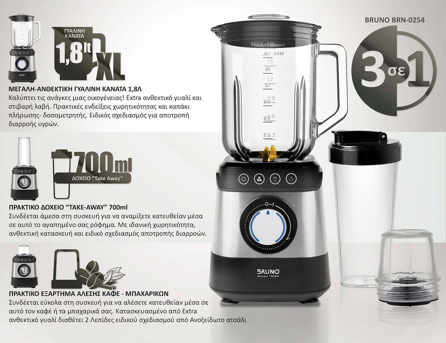 Το σετ περιλαμβάνει: Μπλέντερ με γυάλινη κανάτα 1,8L, Δοχείο Take-Away 700ml, Αλεστής καφέ και μπαχαρικών