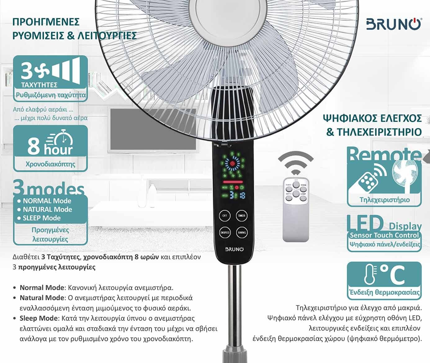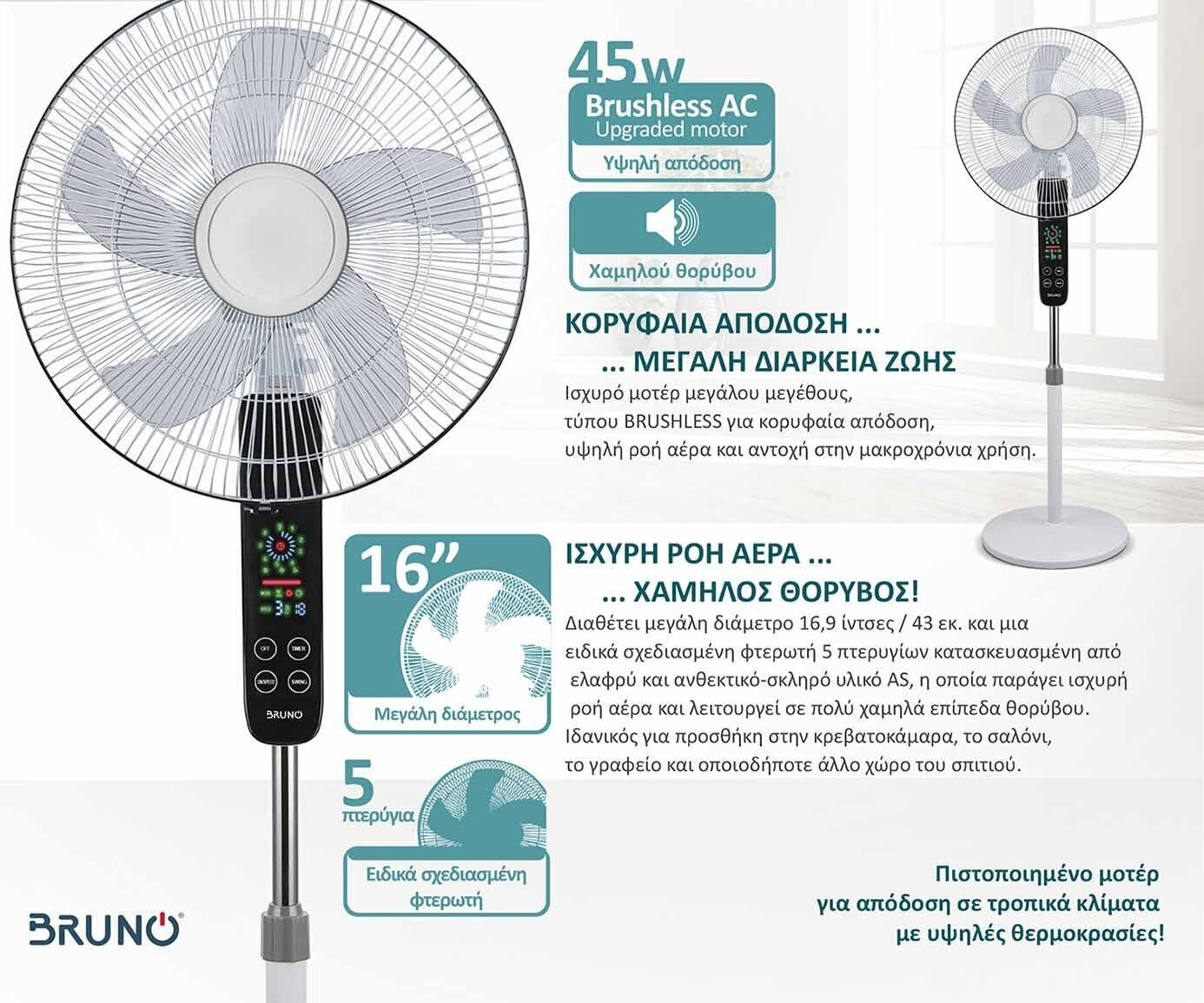 BRUNO ανεμιστήρας προηγμένων λειτουργιών BRN-0189 με τηλεχειριστήριο, 45W, Φ43εκ x 130εκ, λευκός
