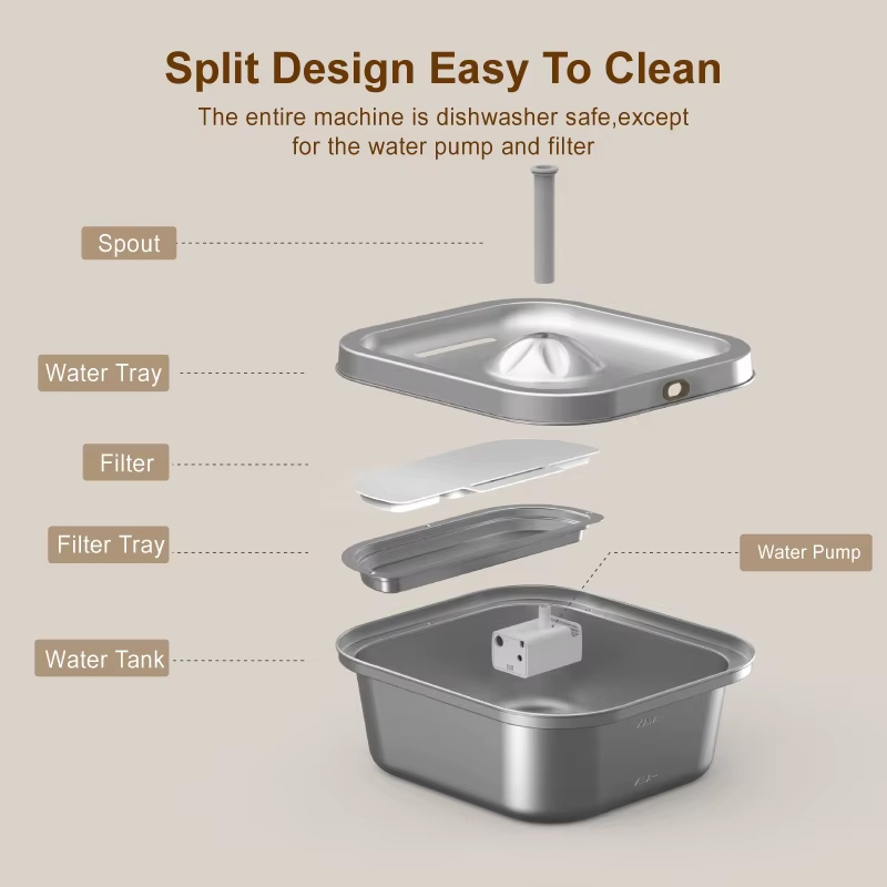 Εξοπλίζεται με κινητήρα που θέτει το νερό σε συνεχή κίνηση φιλτράροντάς το και καθαρίζοντας το από την υπερβολική τρίχα και τη βρωμιά.
