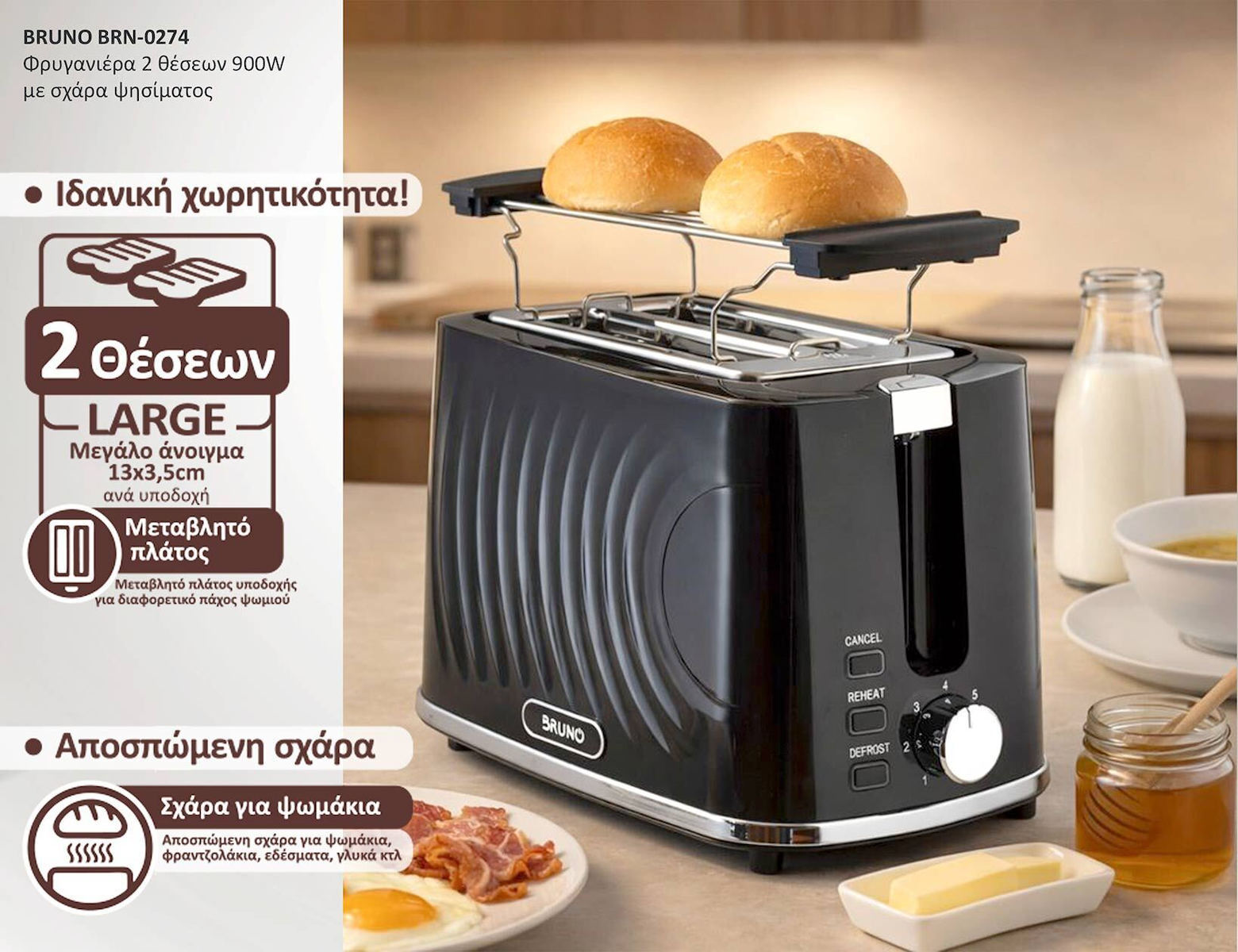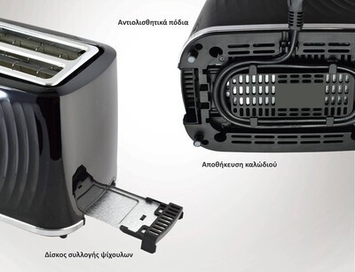 Περιλαμβάνει αποσπώμενη σχάρα για ψωμάκια, αυτόματη ανύψωση και απενεργοποίηση, δίσκο συλλογής ψίχουλων, σώμα cool touch και συστήματα ασφαλείας για άνετη και ασφαλή καθημερινή χρήση.