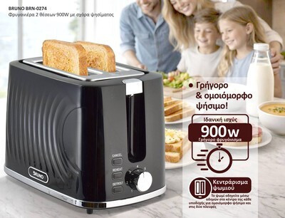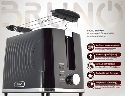 BRUNO φρυγανιέρα BRN-0274, 2 θέσεων, 900W, με σχάρα ψησίματος, μαύρη