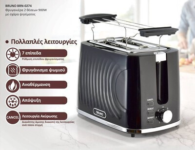 Διαθέτει 7 επίπεδα φρυγανίσματος, λειτουργίες αναθέρμανσης και απόψυξης, καθώς και διακόπτη άμεσης ακύρωσης.