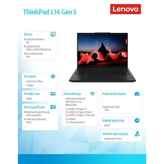 Laptop Lenovo 14" ThinkPad L14 G5 21L10031PB W11Pro Ultra 7 155U/16GB/1TB/INT/14.0 FHD/Black(US Keyboard)