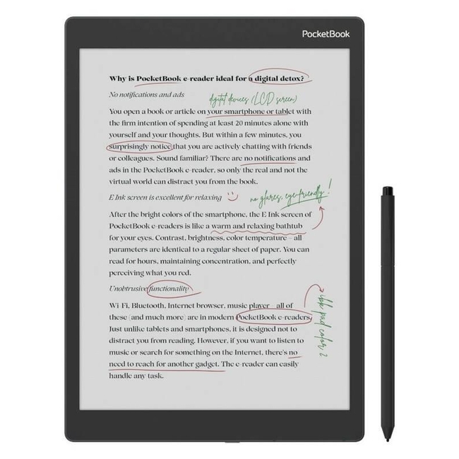 Το PocketBook Color Note είναι ένα πολυλειτουργικό e-reader σχεδιασμένο για ανάγνωση και δημιουργικές δραστηριότητες, διαθέτοντας μια εντυπωσιακή οθόνη E Ink Kaleido 10.3 ιντσών. Αυτή η συσκευή ξεχωρίζει για: