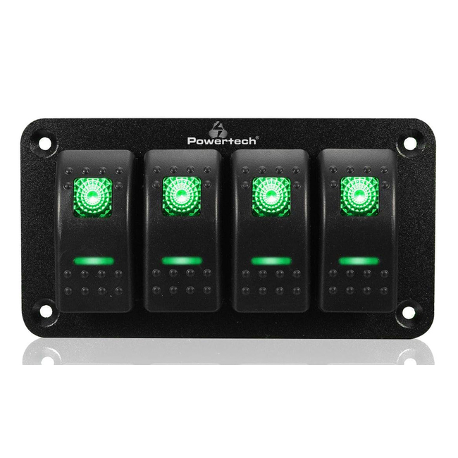 Πάνελ της Powertech, κατάλληλο για τοποθέτηση σε σκάφη και οχήματα όπως τρακτέρ κ.α. Εξοπλίζεται με 4x φωτιζόμενους διακόπτες για σύνδεση με φώτα, κόρνα, υαλοκαθαριστήρες κ.λπ.