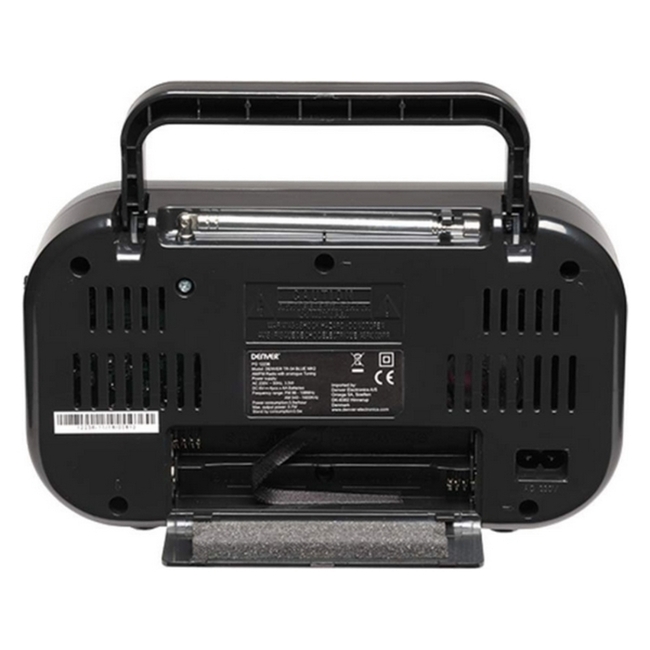 Denver TR-51. Ασύρματη λειτουργία: Προσωπικός (Ατομικός), Τύπος επιλογέα συντονισμού: Αναλογικό, Υποστηριζόμενες συχνότητες: FM. Είδος οθόνης: Αναλογικό. Χρώμα προϊόντος: Μαύρος (Μαύρο), Τύπος κεραίας: Εξωτερικός. Τύπος πηγής ρεύματος: AC, Μπαταρία. Πλάτος συσκευασίας: 225 mm, Βάθος συσκευασίας: 81 mm, Ύψος συσκευασίας: 96 mm