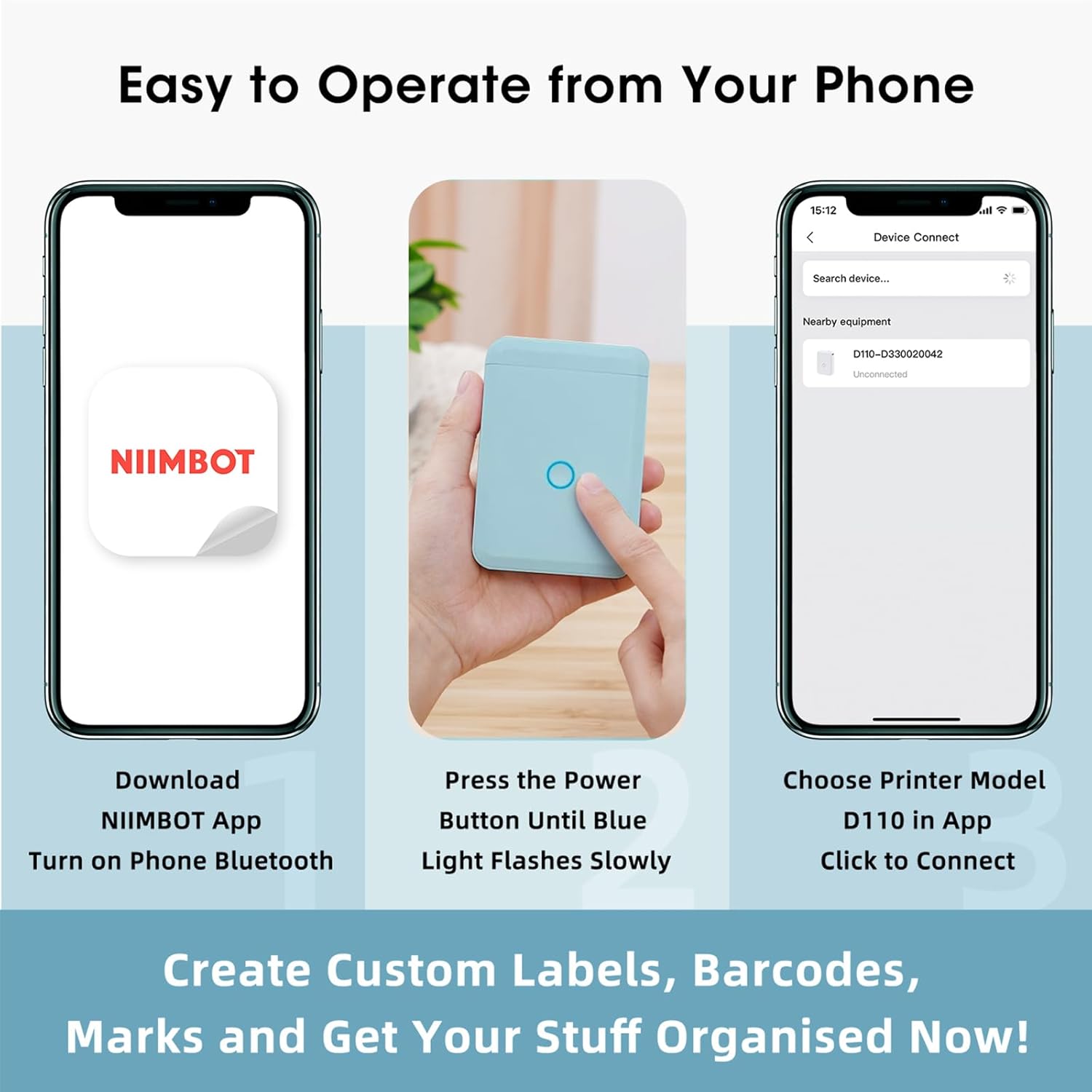 <strong>Βασικές Προδιαγραφές:</strong><ul> <li><strong>Τεχνολογία Συνδεσιμότητας:</strong> Bluetooth</li> <li><strong>Τεχνολογία Εκτύπωσης:</strong> Θερμική</li> <li><strong>Χρώμα:</strong> Ανοιχτό Μπλε</li> <li><strong>Έξοδος Εκτυπωτή:</strong> Μονόχρωμη</li> <li><strong>Μέγιστη Ταχύτητα Εκτύπωσης (Μονόχρωμη):</strong> 25 ppm (σελίδες ανά λεπτό)</li> <li><strong>Διαστάσεις Προϊόντος:</strong> 7 εκ. Β x 10 εκ. Π x 2 εκ. Υ</li> <li><strong>Τύπος Ελεγκτή:</strong> iOS (συμβατό με smartphone)</li></ul><strong>Ειδικά Χαρακτηριστικά:</strong><ul> <li><strong>Έξυπνη Εκτύπωση:</strong> Ο νέος ετικετογράφος NIIMBOT D110 συνδυάζει την εκτύπωση με θερμική τεχνολογία, εξαλείφοντας την ανάγκη για μελάνι και τόνερ, με χαμηλότερο κόστος σε σύγκριση με τους εκτυπωτές μελάνης. Διαθέτει μπαταρία μεγάλης χωρητικότητας 1500mAh που επιτρέπει συνεχή εκτύπωση για έως και 4 ώρες μετά από πλήρη φόρτιση.</li> <li><strong>Σύνδεση Bluetooth:</strong> Εγκαταστήστε την εφαρμογή NIIMBOT από το Apple Store ή το Google Play -&gt; Εισέλθετε στην εφαρμογή και ενεργοποιήστε τη συσκευή -&gt; Πατήστε το κουμπί "Unconnected" στην κορυφή της οθόνης και επιλέξτε το μοντέλο εκτυπωτή D110 από το μενού -&gt; Συνδέστε τη συσκευή μέσω Bluetooth. Δημιουργήστε και εξατομικεύστε ετικέτες εύκολα από το κινητό σας.</li> <li><strong>Ποικιλία Ταινιών:</strong> Χρησιμοποιεί διάφορους τύπους ταινιών ετικετών, όπως λευκές, έγχρωμες, με φρούτα, με άνθη κερασιάς, ετικέτες καλωδίων, και σπάνιες διαφανείς στρογγυλές ετικέτες. Οι ταινίες NIIMBOT είναι μακράς διάρκειας, αδιάβροχες, καθαριζόμενες, ανθεκτικές στο σκίσιμο, αυτοκόλλητες, ανθεκτικές στην τριβή και χωρίς BPA. Μέγιστο μέγεθος ετικέτας 15mm, κατάλληλες για τιμοκαταλόγους, αναγνώριση προσωπικών αντικειμένων, μαρκάρισμα ημερομηνιών τροφίμων, αναγνώριση καλωδίων κ.α.</li> <li><strong>Έξυπνη Επεξεργασία Ετικετών:</strong> Χωρίς την παραδοσιακή οθόνη και πληκτρολόγιο, χρησιμοποιεί την εφαρμογή για την επεξεργασία ετικετών. Μπορείτε να προσαρμόσετε το περιεχόμενο εκτύπωσης, όπως κείμενο, μικρές εικόνες, ημερομηνίες, σύνορα, αυτοκόλλητα, γραμμές, σύμβολα, λογότυπα, σύμβολα και εικονίδια. Υποστηρίζει πολλές γλώσσες και γραμματοσειρές, με ελεύθερη προσαρμογή μεγέθους και θέσης. Διαθέτει επίσης κοινά πρότυπα για γρήγορη εκτύπωση και υποστηρίζει την εισαγωγή αρχείων Excel για συνεχή εκτύπωση.</li> <li><strong>Ευρεία Χρήση:</strong> Ιδανικό για την επισήμανση φαρμακείων, ραφιών με μπαχαρικά, καλλυντικών, θηκών κοσμημάτων, φακέλων, δοχείων αποθήκευσης τροφίμων, μπουκαλιών, γλαστρών και πολλών άλλων καθημερινών εργασιών στο σπίτι ή στο γραφείο. Είναι ένα ιδανικό δώρο για τα Χριστούγεννα, τη Γιορτή της Μητέρας, τη Γιορτή του Πατέρα, την Πρωτοχρονιά για παιδιά, οικογένεια και φίλους.</li></ul>