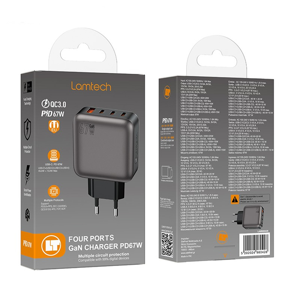 Φορτιστής Πρίζας Lamtech Four Ports Gan Pd67W Grey