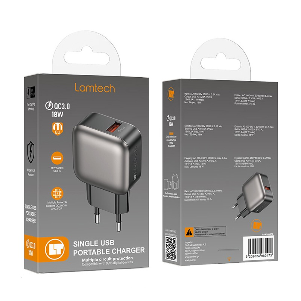 Φορτιστής Πρίζας Lamtech Single USB Qc3.0 18W Grey