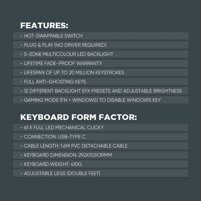 <p data-start="153" data-end="243"><strong>Armaggeddon MKA-1C Nex – 61 Πλήκτρα Mechanical Keyboard Λευκό (Tactile Brown Switch)</strong></p><p data-start="245" data-end="548">Αναβαθμίστε την εμπειρία σας στο gaming και την πληκτρολόγηση με το <strong data-start="313" data-end="339">Armaggeddon MKA-1C Nex</strong>, ένα compact 61 πλήκτρων μηχανικό πληκτρολόγιο που συνδυάζει κορυφαία απόδοση, ανθεκτικότητα και στυλ. Ιδανικό για gamers και δημιουργούς που αναζητούν ακρίβεια, ταχύτητα και δυνατότητα πλήρους προσαρμογής.</p><p data-start="550" data-end="578"><strong>Κύρια Χαρακτηριστικά:</strong></p><ul data-start="580" data-end="1568"> <li data-start="580" data-end="686"><p data-start="582" data-end="686"><strong data-start="582" data-end="614">61 Keys KevlarTech Keyboard:</strong> Ανθεκτικό, στιβαρό και compact για άνετη χρήση και εύκολη φορητότητα.</p></li> <li data-start="687" data-end="875"><p data-start="689" data-end="875"><strong data-start="689" data-end="724">Hot-Swappable Modular Switches:</strong> Αντικαταστήστε τα πλήκτρα χωρίς να χρειάζεστε drivers ή τεχνική υποστήριξη, με Tactile Brown Switches για ικανοποιητική αίσθηση και ακριβή απόκριση.</p></li> <li data-start="876" data-end="974"><p data-start="878" data-end="974"><strong data-start="878" data-end="919">Lifespan Up to 20 Million Keystrokes:</strong> Αξιοπιστία και ανθεκτικότητα που διαρκεί για χρόνια.</p></li> <li data-start="975" data-end="1092"><p data-start="977" data-end="1092"><strong data-start="977" data-end="1023">Custom Satellite Axis &amp; Hot-Swappable PCB:</strong> Επιτρέπει πλήρη παραμετροποίηση και εύκολη συντήρηση των switches.</p></li> <li data-start="1093" data-end="1214"><p data-start="1095" data-end="1214"><strong data-start="1095" data-end="1116">Ergonomic Design:</strong> Ρυθμιζόμενα πόδια και εργονομικό προφίλ για άνετη πληκτρολόγηση ακόμα και σε μακροχρόνια χρήση.</p></li> <li data-start="1215" data-end="1369"><p data-start="1217" data-end="1369"><strong data-start="1217" data-end="1247">Multicolour LED Backlight:</strong> 5 ζώνες φωτισμού, 12 προκαθορισμένα εφέ και ρυθμιζόμενη φωτεινότητα για να δημιουργήσετε τη δική σας gaming ατμόσφαιρα.</p></li> <li data-start="1370" data-end="1465"><p data-start="1372" data-end="1465"><strong data-start="1372" data-end="1404">Detachable USB Type-C Cable:</strong> Αποσπώμενο καλώδιο για εύκολη μεταφορά και ασφαλή σύνδεση.</p></li> <li data-start="1466" data-end="1568"><p data-start="1468" data-end="1568"><strong data-start="1468" data-end="1506">Sleek Sporty Design &amp; Lightweight:</strong> Κομψό λευκό χρώμα με μοντέρνο design και ελαφριά κατασκευή.</p></li></ul><p data-start="1570" data-end="1600"><strong>Τεχνικά Χαρακτηριστικά:</strong></p><ul data-start="854" data-end="1027"> <li data-start="854" data-end="874"><p data-start="856" data-end="874"><strong data-start="856" data-end="866">Τύπος:</strong> Wired</p></li> <li data-start="875" data-end="904"><p data-start="877" data-end="904"><strong data-start="877" data-end="898">Μηχανικά Πλήκτρα:</strong> Ναι</p></li> <li data-start="905" data-end="932"><p data-start="907" data-end="932"><strong data-start="907" data-end="924">Τύπος Switch:</strong> Brown</p></li> <li data-start="933" data-end="961"><p data-start="935" data-end="961"><strong data-start="935" data-end="956">Αριθμός Πλήκτρων:</strong> 61</p></li> <li data-start="962" data-end="1027"><p data-start="964" data-end="1027"><strong data-start="964" data-end="977">Φωτισμός:</strong> 5-zone RGB, 12 presets, ρυθμιζόμενη φωτεινότητα</p></li></ul><p data-start="1029" data-end="1158">Συμπαγές, κομψό και ανθεκτικό, το <strong data-start="1063" data-end="1077">MKA-1C Nex</strong> προσφέρει μια premium εμπειρία μηχανικού πληκτρολογίου για gaming και εργασία.</p><img id="sg-11134202-7reod-m1p15jzu1suc6d" class="fr-fic fr-dii" src="https://cf.shopee.com.my/file/sg-11134202-7reod-m1p15jzu1suc6d" /><img id="sg-11134202-7repf-m1p15kadkyuufa" class="fr-fic fr-dii" src="https://cf.shopee.com.my/file/sg-11134202-7repf-m1p15kadkyuufa" /><img id="sg-11134202-7reoc-m1p15kpmymv801" class="fr-fic fr-dii" src="https://cf.shopee.com.my/file/sg-11134202-7reoc-m1p15kpmymv801" /><img id="sg-11134202-7reoi-m1p15kzckfk9d9" class="fr-fic fr-dii" src="https://cf.shopee.com.my/file/sg-11134202-7reoi-m1p15kzckfk9d9" /><img id="sg-11134202-7reoj-m1p15l8i70w412" class="fr-fic fr-dii" src="https://cf.shopee.com.my/file/sg-11134202-7reoj-m1p15l8i70w412" /><img id="sg-11134202-7renw-m1p15ljlqs786e" class="fr-fic fr-dii" src="https://cf.shopee.com.my/file/sg-11134202-7renw-m1p15ljlqs786e" /><img id="sg-11134202-7reqh-m1p15luza4p422" class="fr-fic fr-dii" src="https://cf.shopee.com.my/file/sg-11134202-7reqh-m1p15luza4p422" /><img id="sg-11134202-7reqe-m1p15m5suahq97" class="fr-fic fr-dii" src="https://cf.shopee.com.my/file/sg-11134202-7reqe-m1p15m5suahq97" /><img id="sg-11134202-7reo5-m1p15mgmegql37" class="fr-fic fr-dii" src="https://cf.shopee.com.my/file/sg-11134202-7reo5-m1p15mgmegql37" /><img id="sg-11134202-7req4-m1p15mpi2vk476" class="fr-fic fr-dii" src="https://c