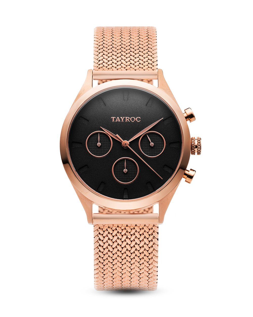 WOMEN WATCH TAYROC TY55 (36MM). Type of mechanism: QUARTZ. Display: ANALOGICAL. Material of case: STAINLESS STEEL. Colour of case: PINK. Material of bracelet: STAINLESS STEEL. Colour of bracelet: PINK. Dial Colour: BLACK. Glass type: MINERAL. Clousure: PRESSURE. Diameter of dial: 36MM. Submersible: 5ATM