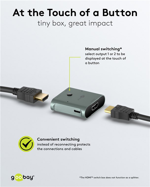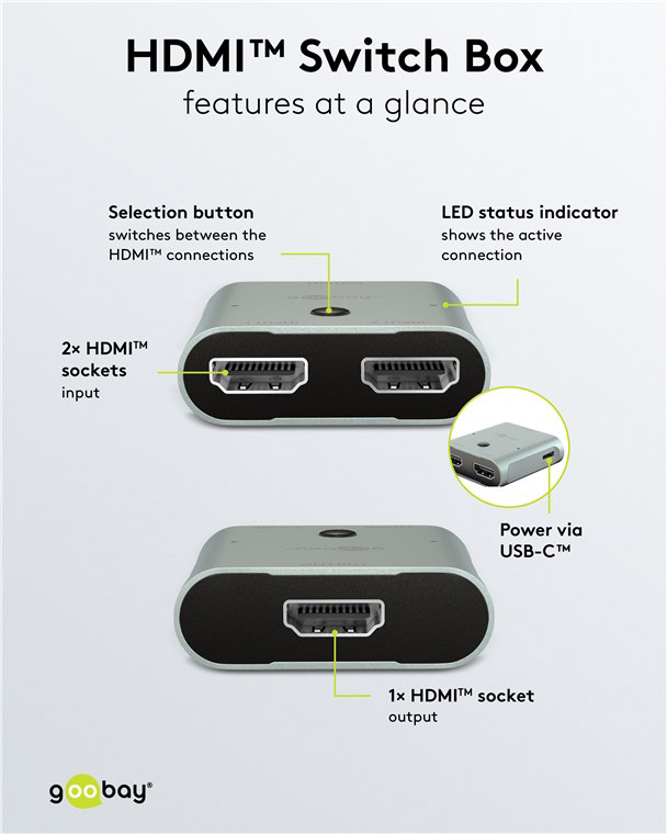 Το HDMI switch της Goobay επιτρέπει την σύνδεση μιας οθόνης σε δύο συσκευές όπως PC, gaming κονσόλες κ.α. με HDMI διεπαφή.