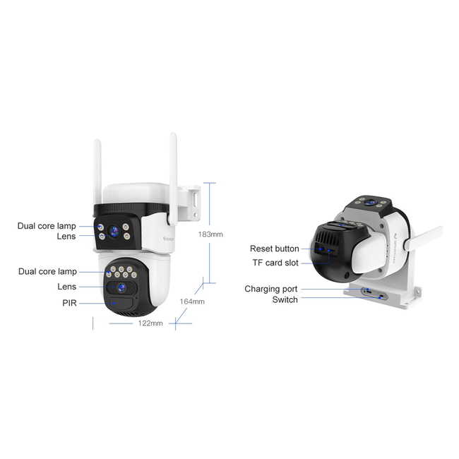 Ενσωματώνει 2 φακούς που επιτρέπουν μεγαλύτερη κάλυψη στον χώρο και υποστηρίζει PTZ λειτουργία που σας επιτρέπει την οριζόντια και κάθετη μετακίνηση της κάμερας μέσω της εφαρμογής.