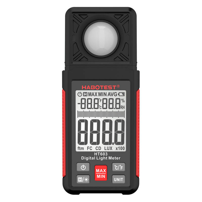 Habotest HT603 is used to measure light intensity in the range of 0~100000 LUX / 0~10000 FC. It will work well in fields such as the electrical industry or for room inspection purposes. It is distinguished by its fast response time, and its rotating probe makes it more convenient to use. What's more, you can also measure the ambient humidity level and temperature with the device. In addition, the HT603 is powered by 3 AAA batteries.