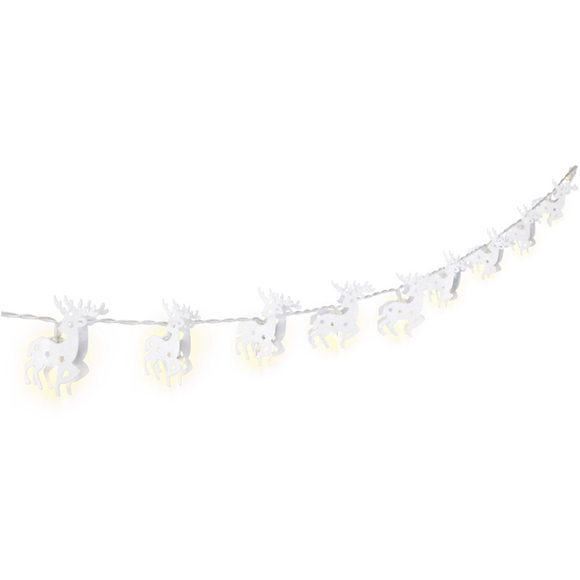 Λαμπάκια LED με διακοσμητικούς μεταλλικούς τάρανδους σε λευκό χρώμα που συνδέονται με ένα διαφανές καλώδιο συνολικού μήκους 1.3 μέτρα. Είναι ιδανικά για την χριστουγεννιάτικη διακόσμηση σε οποιονδήποτε εσωτερικό χώρο.