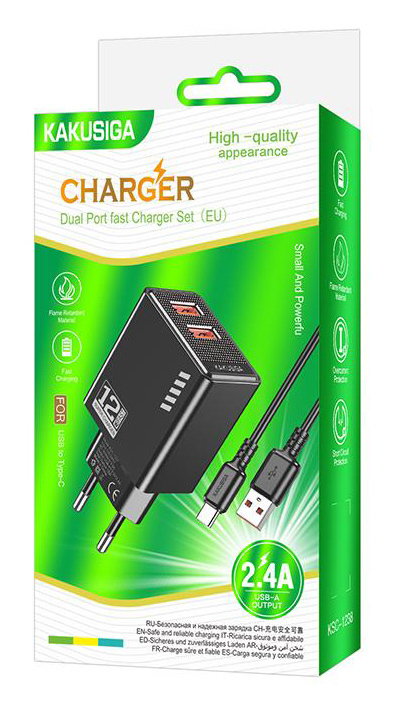 KAKUSIGA φορτιστής τοίχου KSC-1238 με καλώδιο USB-C, 2x USB, 12W, μαύρος