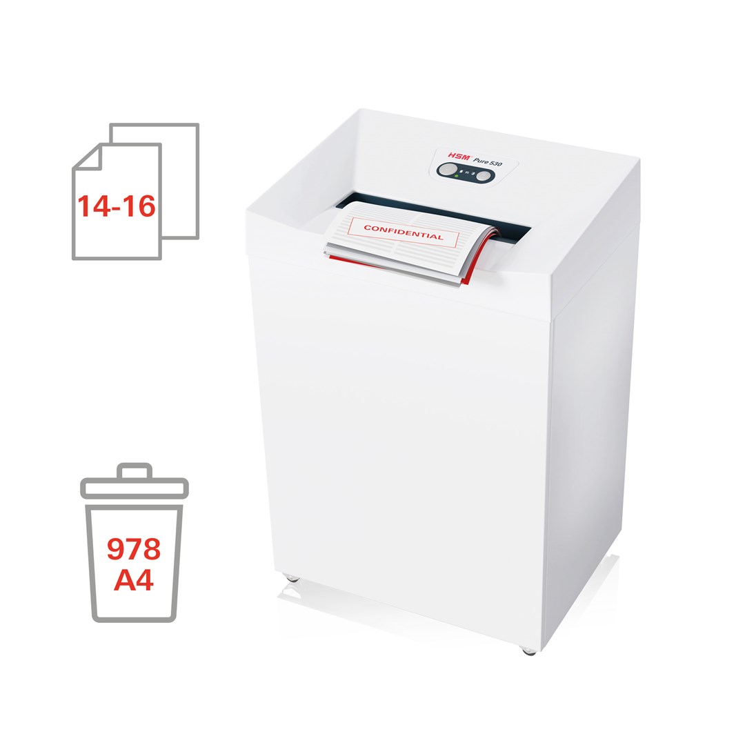 Ο HSM Pure 530 καταστροφέας εγγράφων Particle-cut (strip-cut) είναι μια ιδανική λύση για μεσαία γραφειακή χρήση, σχεδιασμένος με ικανότητα συνεχούς λειτουργίας. Προσφέρει επίπεδο θορύβου περίπου 55 dB, διασφαλίζοντας έναν ήσυχο χώρο εργασίας ενώ αποδεδειγμένα καταστρέφει ευαίσθητα έγγραφα.