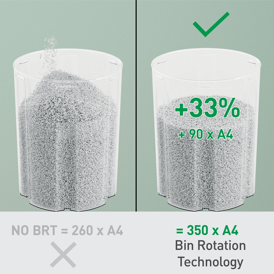 Επίσης, η Τεχνολογία Περιστροφής Κάδου (BRT) βοηθά στην μεγιστοποίηση του διαθέσιμου χώρου στον κάδο διανέμοντας ομοιόμορφα τα κομμένα χαρτιά, αυξάνοντας την χωρητικότητα.
