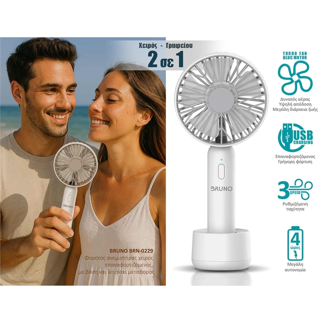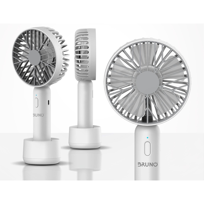 BRUNO BRN-0229 Φορητός ανεμιστήρας χειρός επαναφορτιζόμενος, με βάση και λουράκι μεταφοράς, λευκός-γκρί