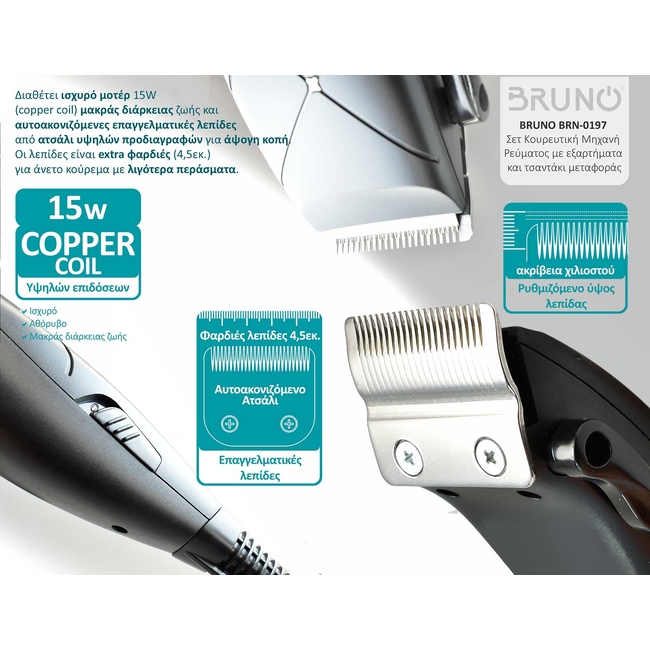 Κόψιμο ή τριμάρισμα, καθάρισμα, σβήσιμο ή ξύρισμα, όποιο και αν είναι το στυλ σας, η κουρευτική μηχανή BRUNO BRN-0197 θα γίνει ο πολύτιμος σύμμαχός σας στην καθημερινή φροντίδα των μαλλιών και γενιών σας.