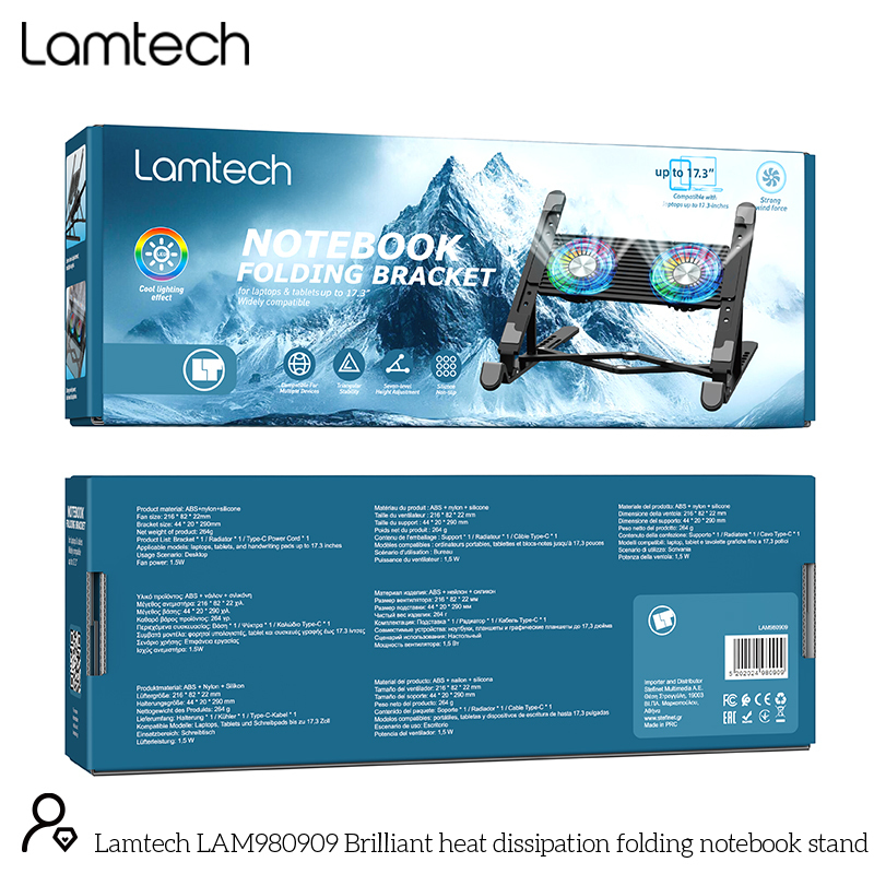 LAMTECH Βάση ψύξης φορητού υπολογιστή RGB μεταλλική πτυσσόμενη 17.3 ίντσες μαύρη