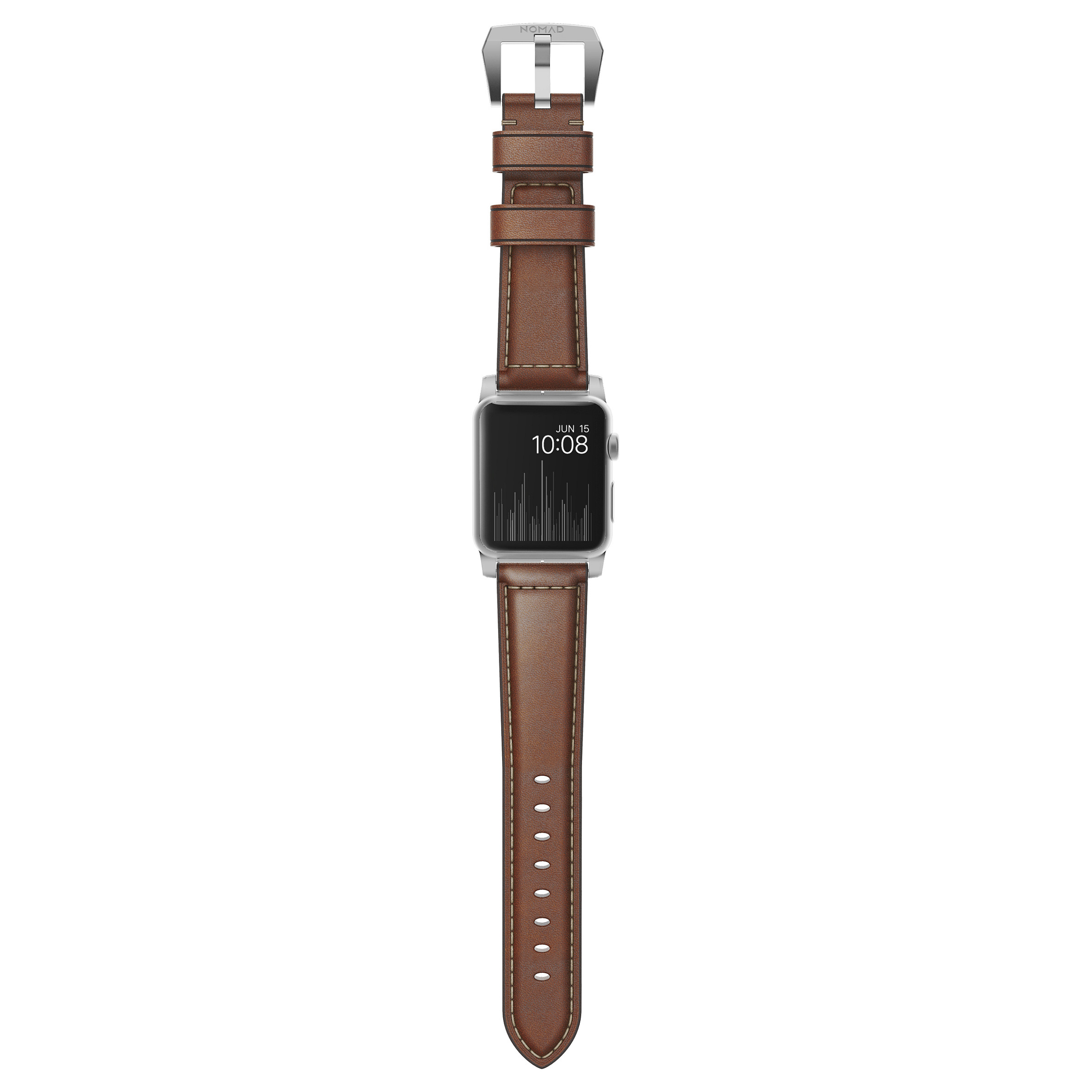 Η Nomad Traditional Band είναι κατασκευασμένη από ρουστίκ καφέ δέρμα που συνδυάζεται με υψηλής ποιότητας ασημένια υλικά. Αυτό το λουράκι είναι συμβατό με πολλαπλά μεγέθη Apple Watch, συμπεριλαμβανομένων των 42mm, 44mm, 45mm και 49mm μοντέλων, κάνοντάς το μια ευέλικτη επιλογή για κάθε χρήστη Apple Watch.