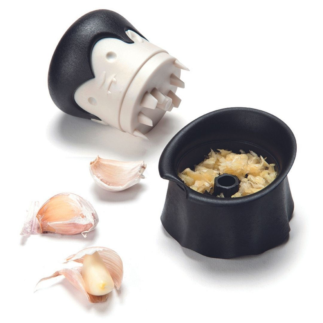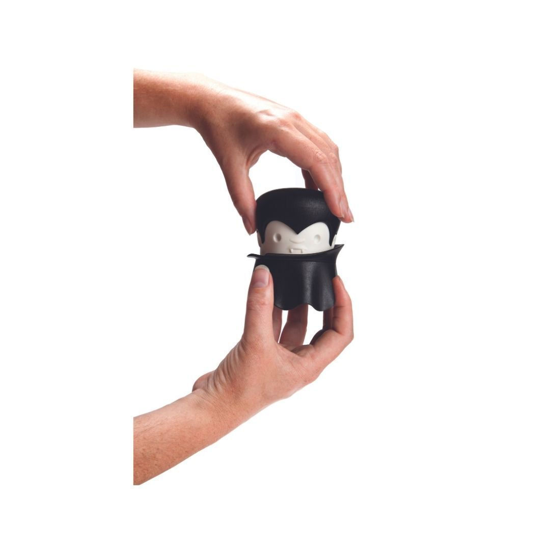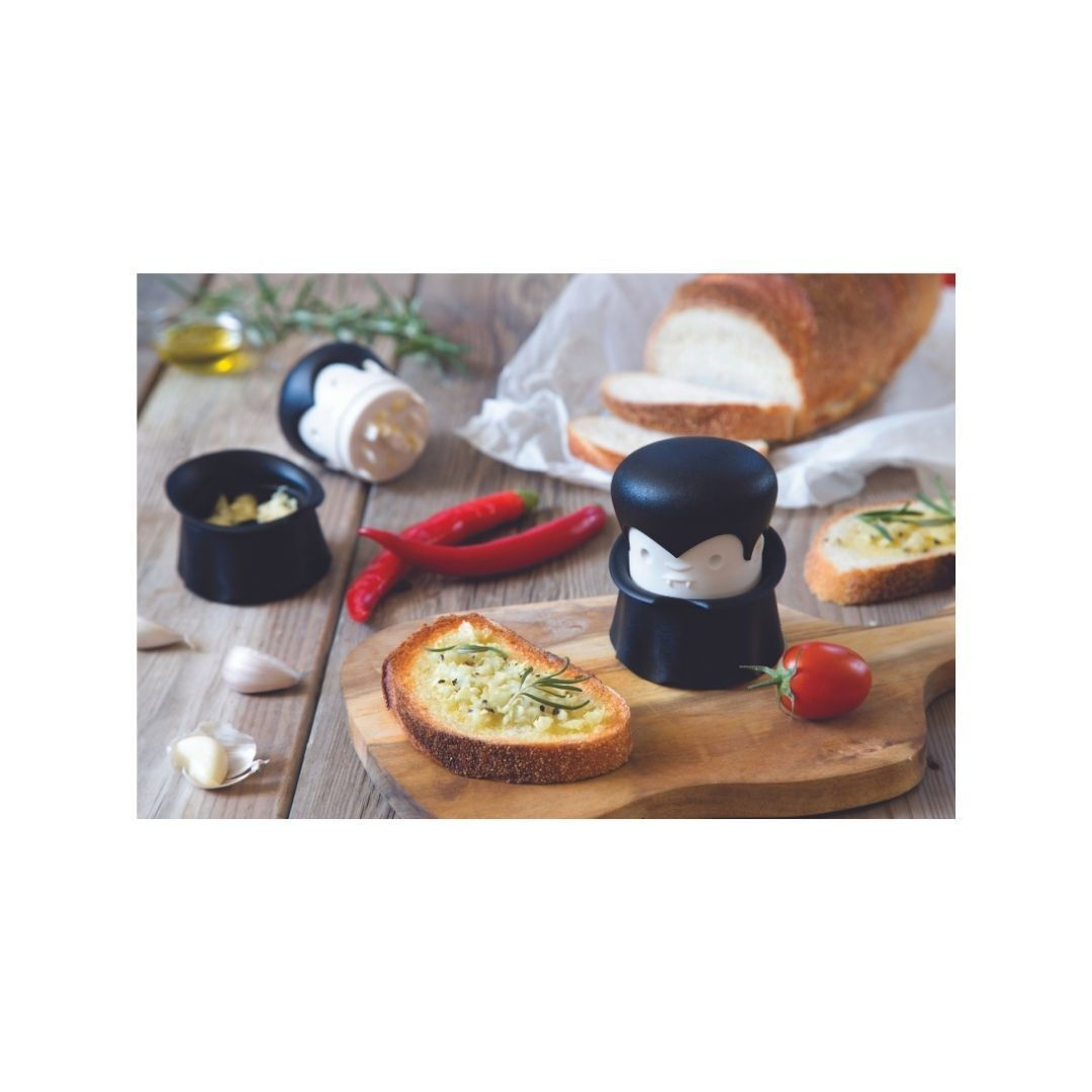 Το OTOTO Gracula Garlic Twist είναι ένα πρωτότυπο εργαλείο κουζίνας τύπου garlic crusher/twist, σχεδιασμένο σε μορφή Dracula. Χρησιμοποιείται για το ψιλοκόψιμο και το σπάσιμο σκόρδου, αλλά και για μικρές ποσότητες από τζίντζερ, ξηρούς καρπούς, βότανα, μπαχαρικά και chili peppers. Είναι κατασκευασμένο από πλαστικό κατάλληλο για τρόφιμα, χωρίς BPA, και έχει μαύρο χρώμα με παιχνιδιάρικο vampiric design. Το προϊόν καθαρίζεται εύκολα, συνιστάται πλύσιμο στο χέρι από την επίσημη πηγή, ενώ αναφέρεται και ως dishwasher-safe από άλλες πηγές. Οι διαστάσεις του είναι περίπου 7,4 x 7,4 x 9 cm και το μοντέλο/MPN είναι OT873. Συνδυάζει πρακτικότητα και διασκεδαστικό design για καθημερινή χρήση στην προετοιμασία φαγητού.