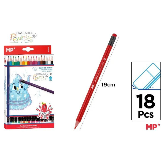 Σετ χρωματιστών ξυλομπογιών της MP σε 18 αποχρώσεις, με ανθεκτική μύτη και εξαιρετική χρωματική απόδοση. Στο επάνω μέρος τους διαθέτουν γόμα, για άμεσο σβήσιμο.