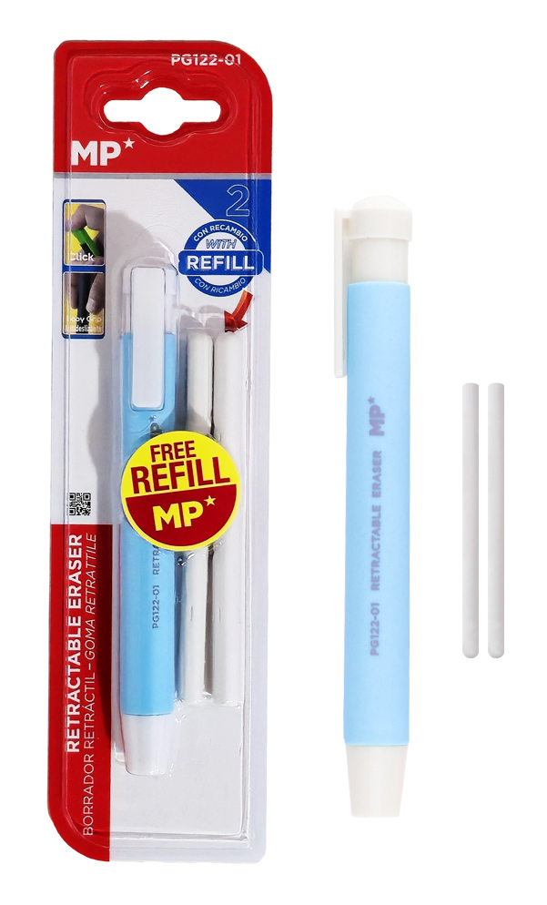 Μηχανική γόμα της MP για εύκολο σβήσιμο μολυβιού, που δεν αφήνει υπολείμματα. Διαθέτει πρακτικό μηχανισμό με κλικ για την προώθηση και επαναφορά της γόμας ενώ στη συσκευασία συμπεριλαμβάνονται 2x ανταλλακτικές γόμες για μεγαλύτερη διάρκεια χρήσης.