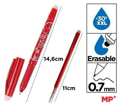 Στυλό διαρκείας της MP με μελάνι που σβήνει μέσω της ειδικής γόμας που διαθέτει. Διαθέτει καπάκι με κλιπ για να ασφαλίζει στις τσέπες των ρούχων και στα τετράδια.