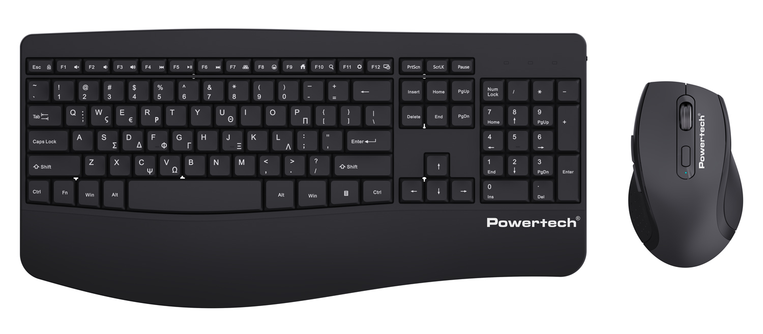 Set περιφερειακών της Powertech που αποτελείται από ασύρματο πληκτρολόγιο και ασύρματο οπτικό ποντίκι. Είναι συμβατά με συσκευές όπως desktop, laptop, tablet κλπ.