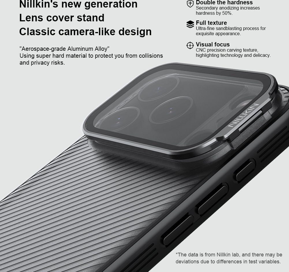 Η θήκη της σειράς CamShield Prop της Nillkin χαρακτηρίζεται από την ενισχυμένη προστασία που προσφέρει, το σκληρό υλικό κατασκευής της με την ανάγλυφη επιφάνεια, αλλά και την έξτρα προστασία των καμερών και της ιδιωτικότητας σας, χάρη στο ανοιγόμενο μεταλλικό καπάκι καμερών, το οποίο μπορεί να χρησιμοποιηθεί και ως stand.