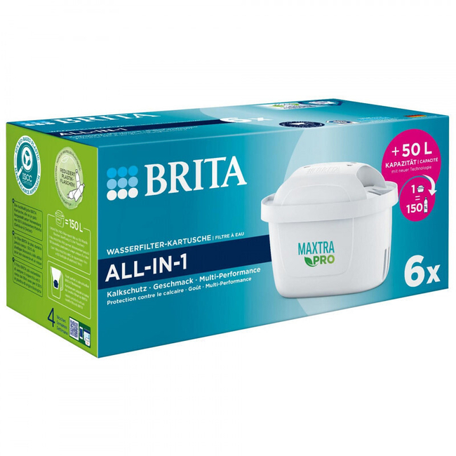 Ανταλλακτικά Φίλτρα Νερού Brita Maxtra Pro σε συσκευασία 6 τεμαχίων, σχεδιασμένα για να βελτιώνουν τη γεύση και την ποιότητα του νερού σας. Αυτά τα φίλτρα απομακρύνουν το χλώριο και άλλες ακαθαρσίες, προσφέροντας καθαρό και υγιεινό νερό.