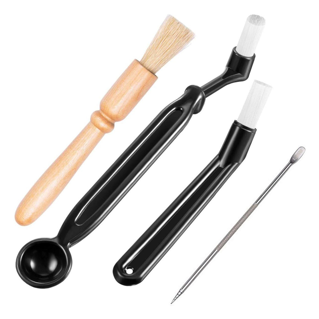 Κιτ καθαρισμού καφετιέρας που αποτελείται από 3 βούρτσες καθαρισμού κατάλληλες για διαφορετική εφαρμογή και 1 κουτάλι για τη διακόσμηση latte.