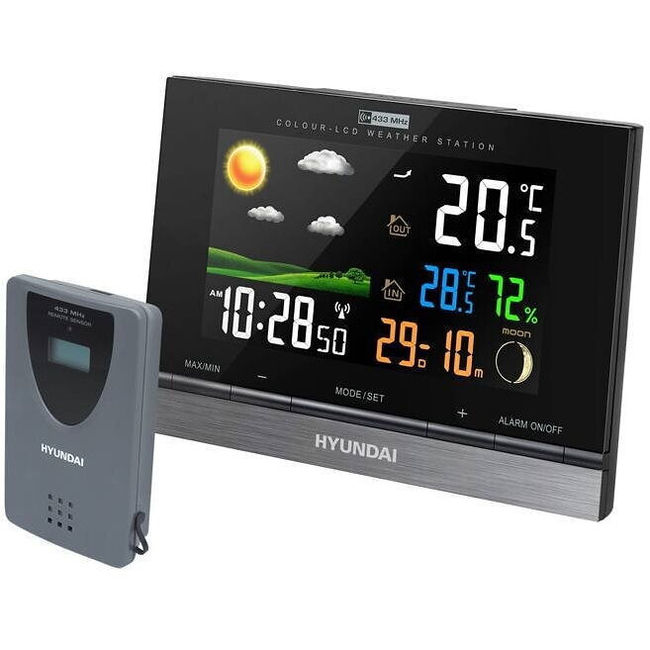 Ο Hyundai WS2303 Μετεωρολογικός Σταθμός είναι μια προηγμένη συσκευή παρακολούθησης καιρού για το σπίτι. Εξοπλισμένος με μια έγχρωμη οθόνη LCD, παρέχει ολοκληρωμένα δεδομένα καιρού, συμπεριλαμβανομένων κινούμενων προβλέψεων, εσωτερικής και εξωτερικής θερμοκρασίας και υγρασίας, καθώς και ακριβείς δυνατότητες παρακολούθησης του χρόνου.