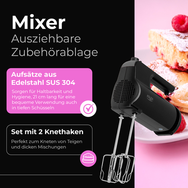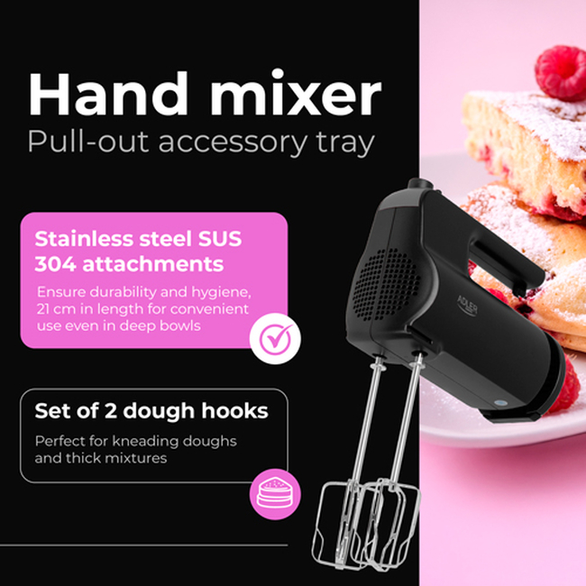Ο Adler Hand Mixer με Pull-Out Tray για Αξεσουάρ (AD 4230) είναι ένα ευέλικτο και αξιόπιστο εργαλείο κουζίνας, σχεδιασμένο να καλύψει τις ανάγκες τόσο των αρχαρίων όσο και των έμπειρων αρτοποιών και μαγείρων. Ο κομψός μαύρος σχεδιασμός του όχι μόνο προσθέτει στυλ στον πάγκο της κουζίνας σας, αλλά ενισχύει και τη λειτουργικότητα.